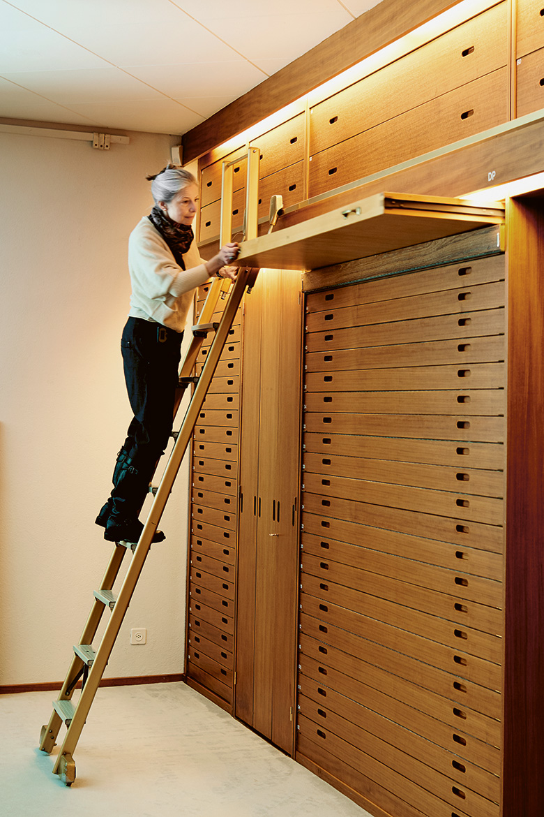 Das alles braucht Zeit. «Ein Luxus, den wir hier haben. Wir möchten den Studierenden vermitteln, dass man damit sehr weit kommen kann. Es braucht Ausdauer und Hartnäckigkeit, ein Gespür für Gewebe, naturwissenschaftliches Wissen zu Verfallsprozessen und kunsthistorische Kenntnisse für die Einordnung des Gegenstands, für seine sogenannte Objektbiografie», so Schorta. Zum Schluss gewährt sie noch einen Einblick in die Lagerung der historischen Textilien, die nicht in der Ausstellung des Museums für Textilien und angewandte Kunst im gleichen Haus oder im Wohnmuseum Villa Abegg gezeigt werden. Im Nebenzimmer des Ateliers zieht sie übermannsgrosse Fächer und Schubladen auf, zeigt herrschaftliche Gewänder, faltenfrei und staubgeschützt, präsentiert Stickfragmente in winzigen Schubladen mit herausnehmbaren Böden, damit die Objekte niemals mehr angefasst werden müssen. Denn: Stoff wird schütter, bevor er dann zu Staub zerfällt. Nur feine Detektivarbeit gegen die Zeit kann einen Hauch von Strumpf zum Wissensschatz machen.