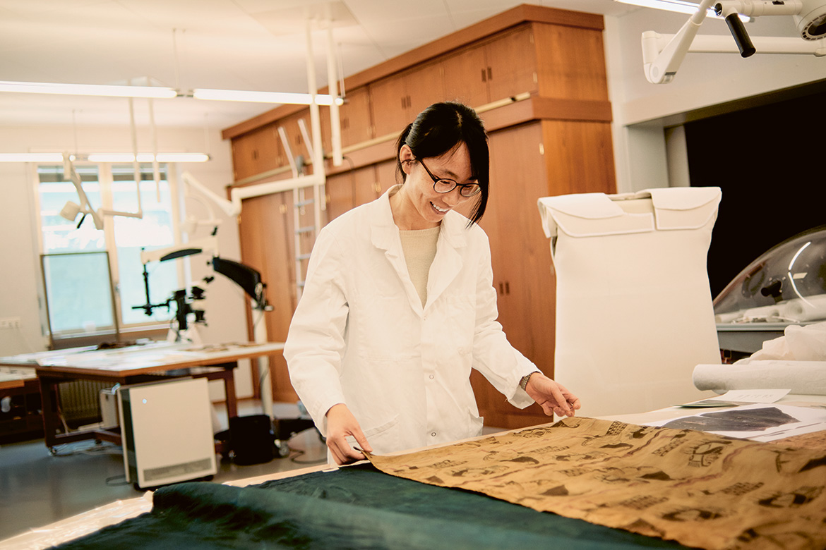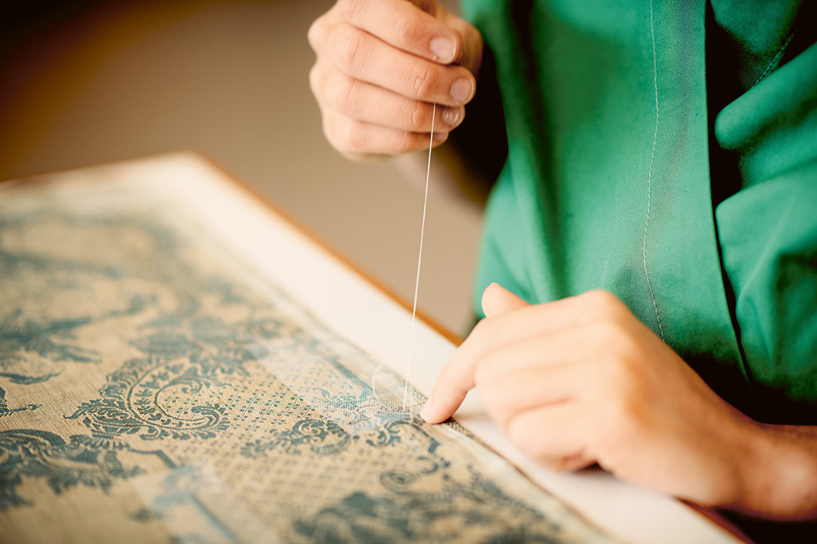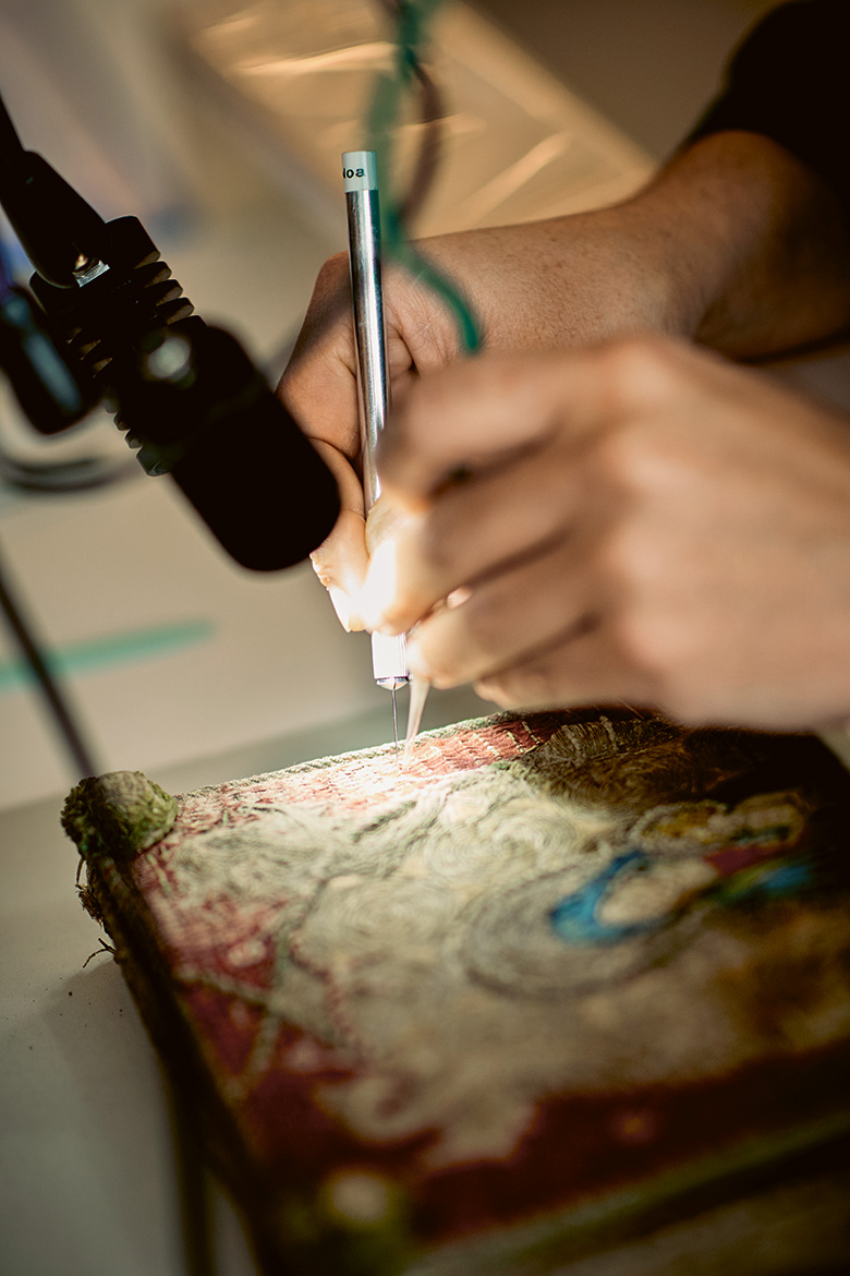 Am Arbeitsplatz gegenüber der raumhohen Materialschrankwand aus Holz pumpt es dumpf im immer gleichen Rhythmus: Noa Quinteiro Carrera aus Spanien sitzt konzentriert über ein Kästchen gebeugt. Es ist ein Dachbodenfund aus dem deutschen Bistum Limburg. Im 15. Jahrhundert diente es als Aufbewahrungsort für das Korporale, ein Leinentüchlein, das während der Messfeier benutzt wird. Carrera hat schon jede einzelne Faser der gestickten Muttergottes auf dem Kästchen abgesaugt und mit dem Mikroskop kontrolliert. «Grauenhaft, wie schmutzig sie war», die Studentin lacht. «Aber ein Kästchen aus Holz, bestickt mit Seiden- und Metallfäden, kann man nun mal nicht einfach waschen.» Einen ganzen Monat lang schon, Tag für Tag, hat sie hier gesaugt – allein am Deckel. «Das ist Meditation, aber immer in Beziehung zum Objekt und zu meiner Arbeit daran. Ich lerne die Stickerei und ihren Erhaltungszustand kennen, sehe Details, deute sie.»