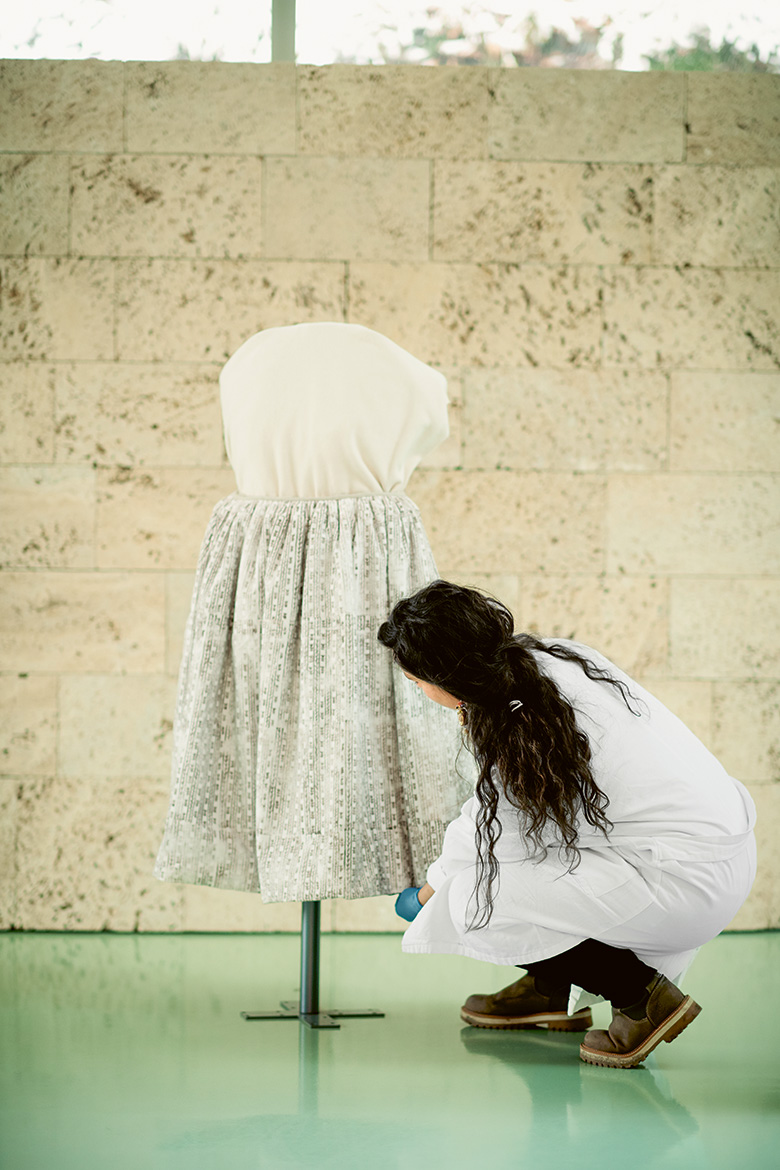 Boncioli zupft mit spitzen Fingern am Bund eines Rocks. Erst jetzt fällt der Kleiderständer mit dem bodenlangen Gewand auf, das neben den originalen Fragmenten geradezu blass wirkt. «Der Oberstoff hat eine horizontale Teilungsnaht knapp unterhalb der Taille. Erst als ich diese Kopie des Rocks anfertigte, verstand ich, warum: So wirkt er voluminöser. » Die Rekonstruktion ist der Höhepunkt der wissenschaftlichen Arbeit von Boncioli, das fertige Puzzle.