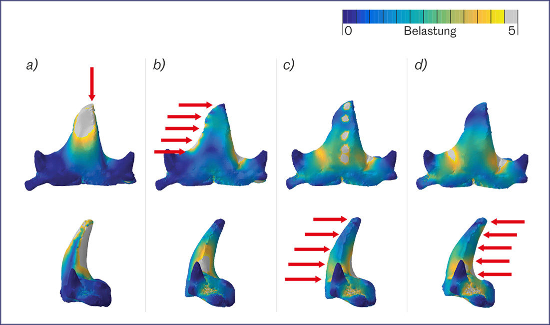 Vor 370 Millionen Jahren war der haiähnliche Ctenacanthus ein Spitzenraubtier im Urzeitmeer. Er packte seine Beute und riss durch Kopfschütteln grosse Bissen heraus. Dies ergab die mechanische Analyse eines fossilen Zahns mit simuliertem Druck (Pfeile): Zubeissen (a) und Schütteln (b) belasten den Zahn nur lokal. Beim Festhalten (c, d) verteilt sich der Druck jedoch auf ungünstige Weise. Die Beute wurde also nicht fixiert und zerkaut, so das Team der Uni Zürich.