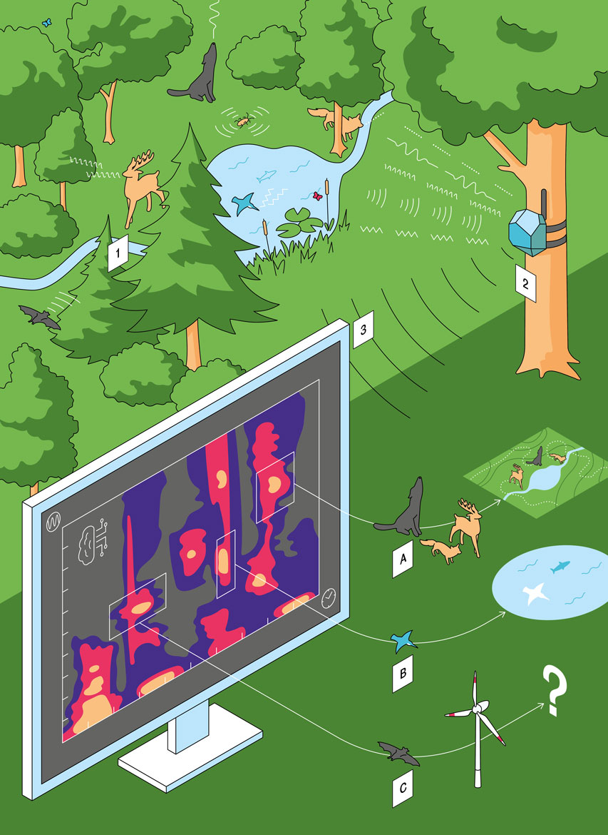 Um die Tierwelt in unseren Wäldern oder Bergen umfassend zu beobachten, bräuchte es Expertinnen und Experten, die Tag und Nacht und bei jedem Wetter auf der Lauer liegen. Abgesehen von den praktischen Herausforderungen würde die Anwesenheit von Menschen die Tiere stören. Das EPFL-Start-up Synature setzt nun auf die Untersuchung von Ökosystemen anhand von Geräuschen der Fauna. Dafür entwickelt es ein System, das mehrere tausend Arten identifizieren kann, mit einer Reichweite von bis zu drei Kilo­metern für die stimmgewaltigsten Arten wie Wölfe.